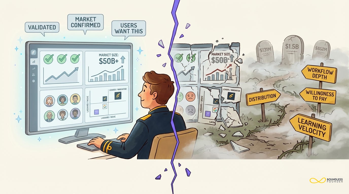 The pattern is the same in every case. They all proved "customers want this." None of them proved "customers will pay us specifically, and keep paying, when alternatives appear."