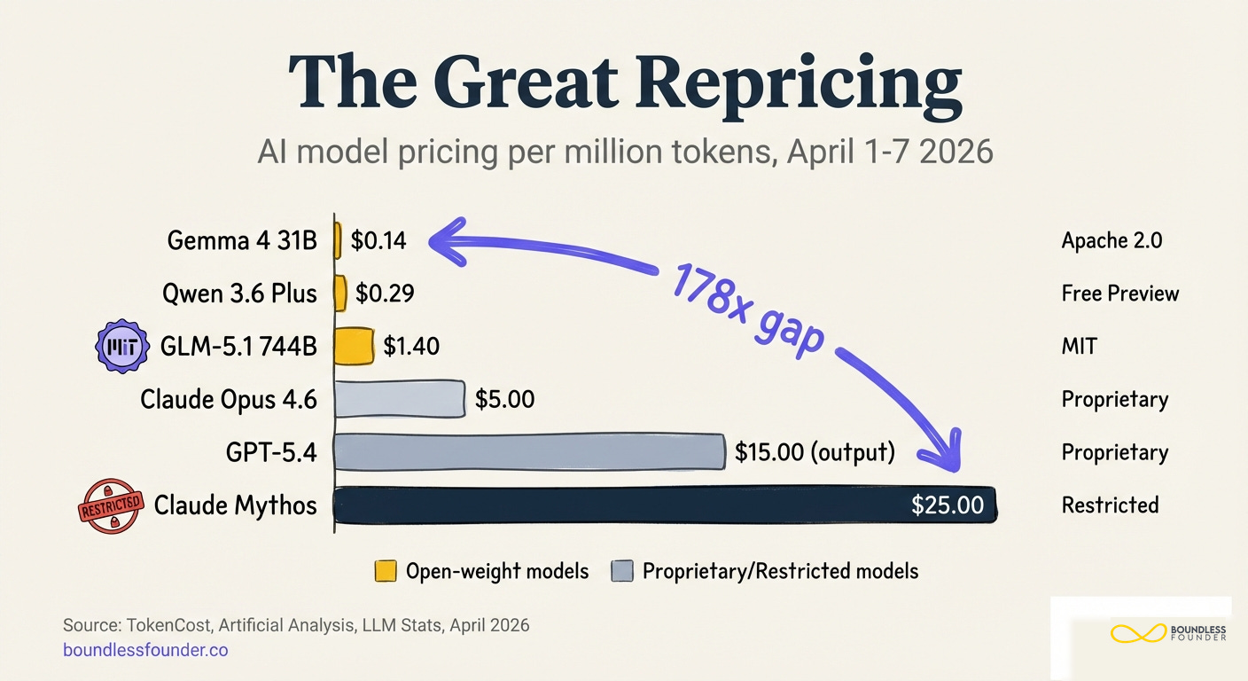 The price gap between the cheapest and most expensive models released that week: 178x. Gemma 4 at fourteen cents per million tokens. Mythos at twenty-five dollars.