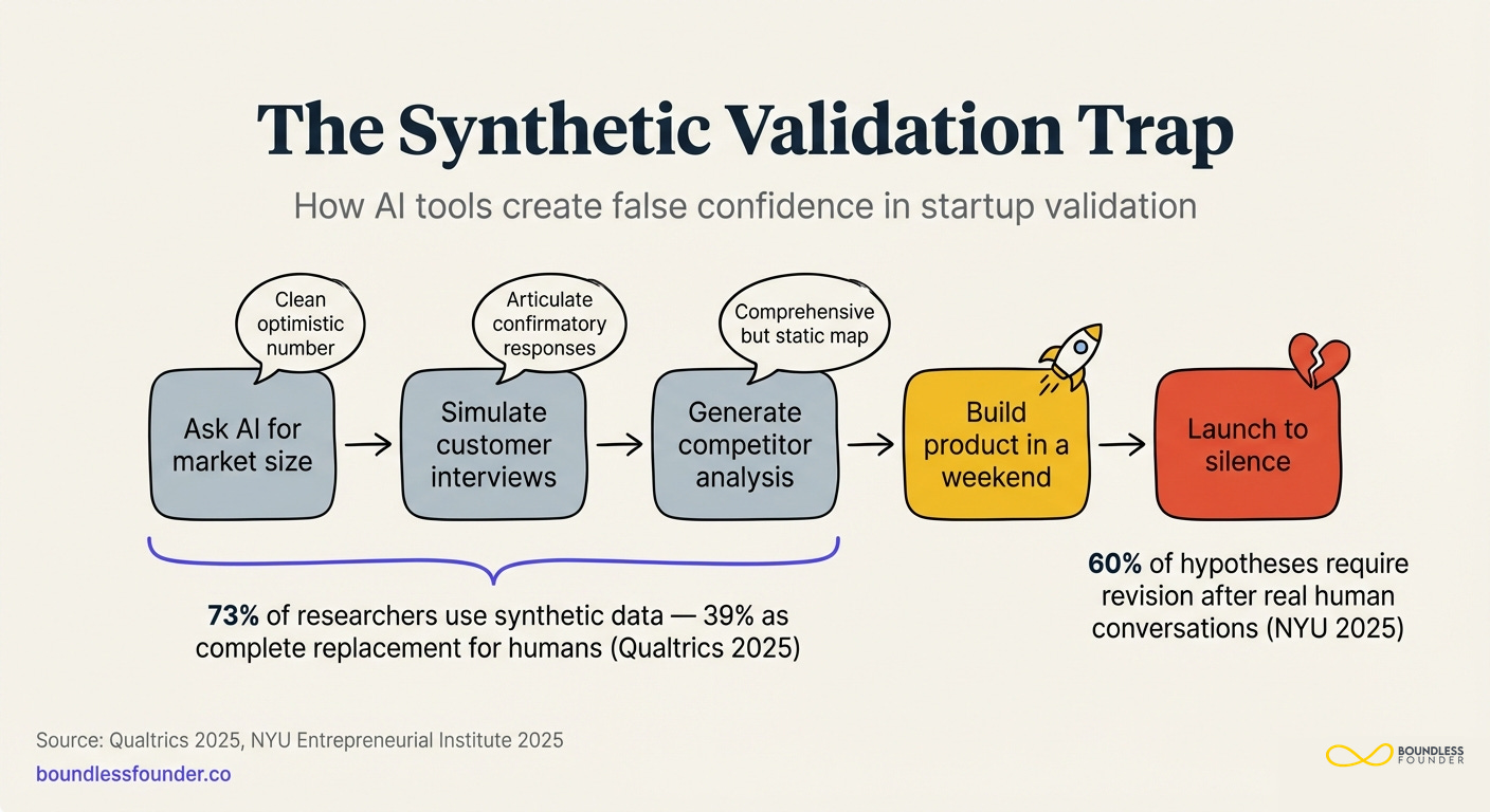 A founder has an idea for an AI product. She starts by asking ChatGPT to assess market size. It returns a clean, well-structured analysis with numbers that look credible. She uses Claude to simulate customer discovery conversations — "pretend you're a VP of Engineering at a mid-market SaaS company, and tell me about your pain points with code review." The responses are articulate, consistent, and confirmatory. She asks Gemini to generate a competitive landscape analysis. It produces a comprehensive map with quadrants and positioning. She builds the product in a weekend — because building is now trivial — and launches.